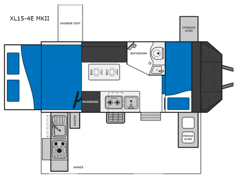 This trailer is perfect for families and is ready for adventure when you are! There is an Olympic queen-size bed in the back plus a set of bunk beds up front, allowing you to sleep four! Not only does this model include an interior three burner cooktop, but there is also an exterior slide out kitchen for when you want to get some fresh air! The wet bath lets you clean up each day, and you'll also appreciate the hot/cold external shower with a wall-mounted shower tent.