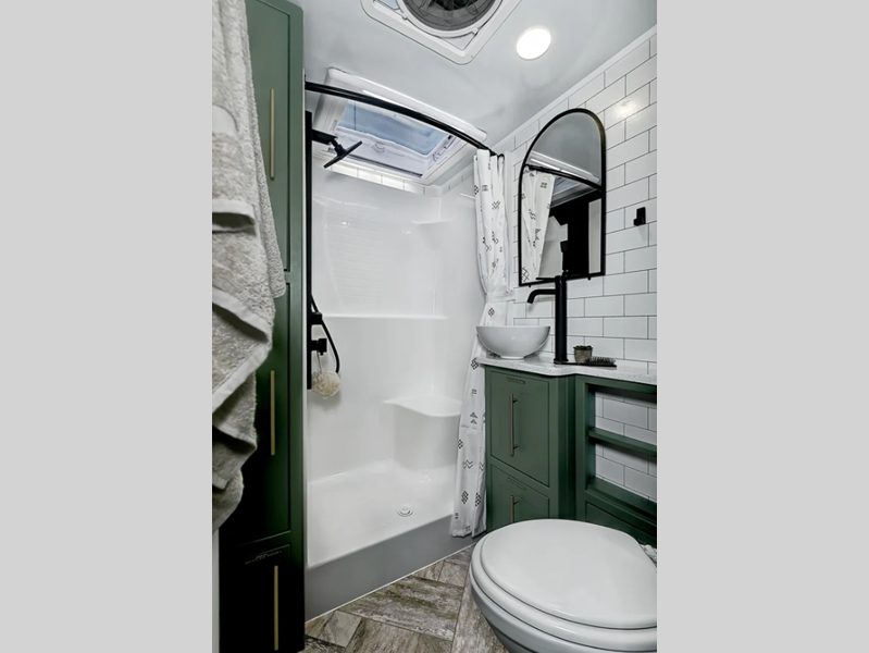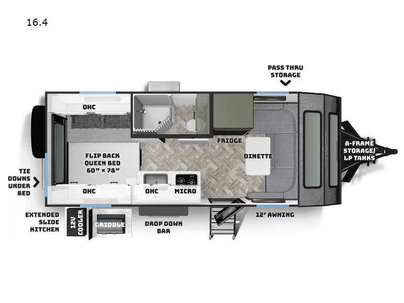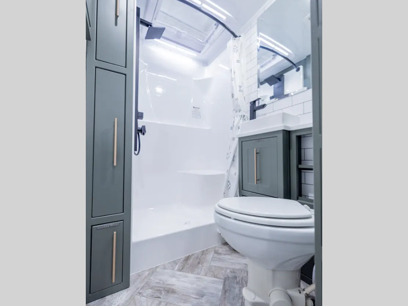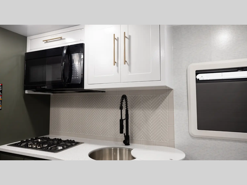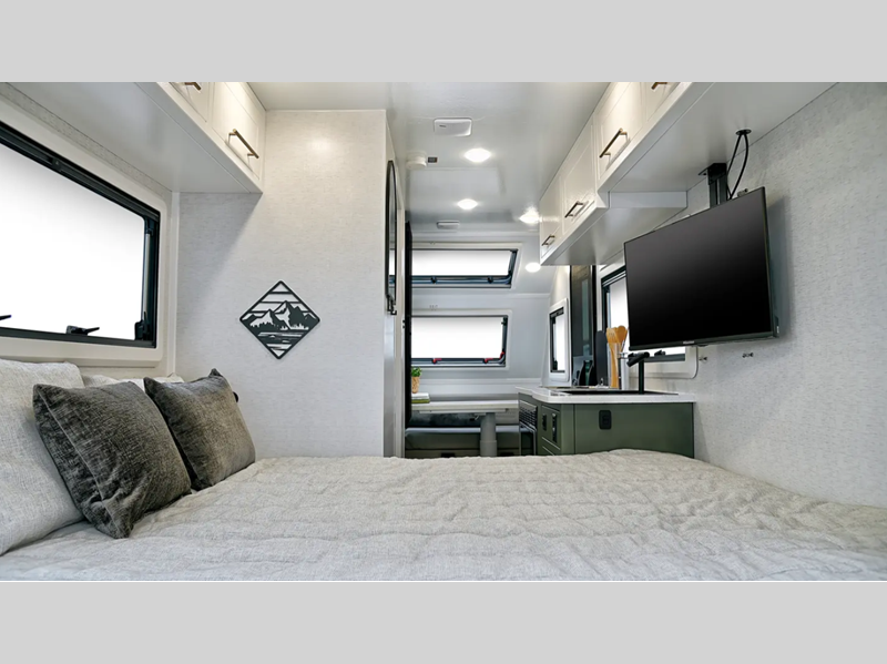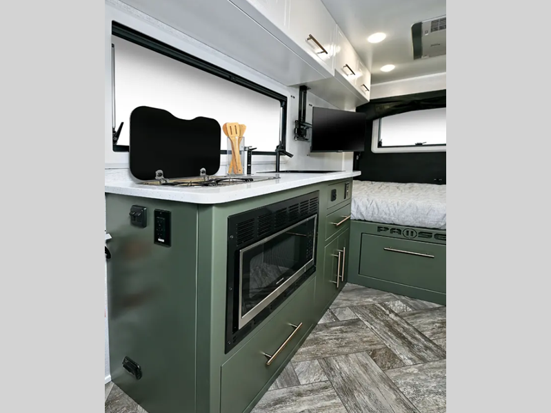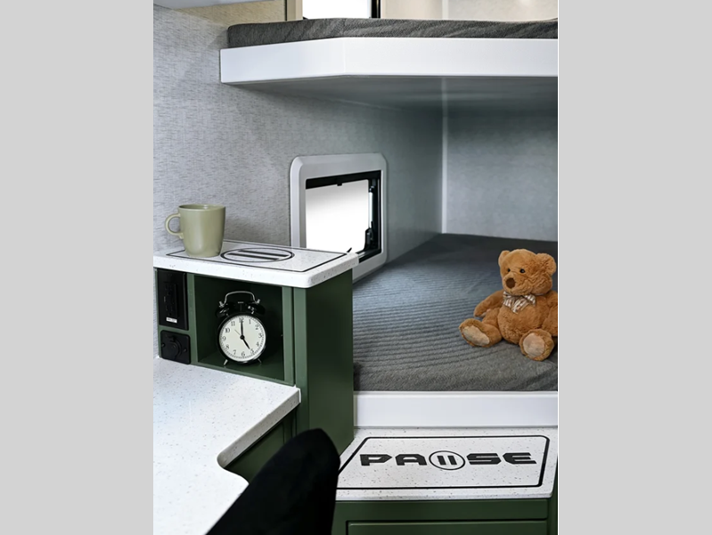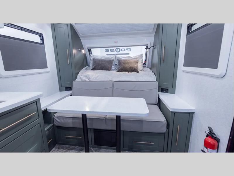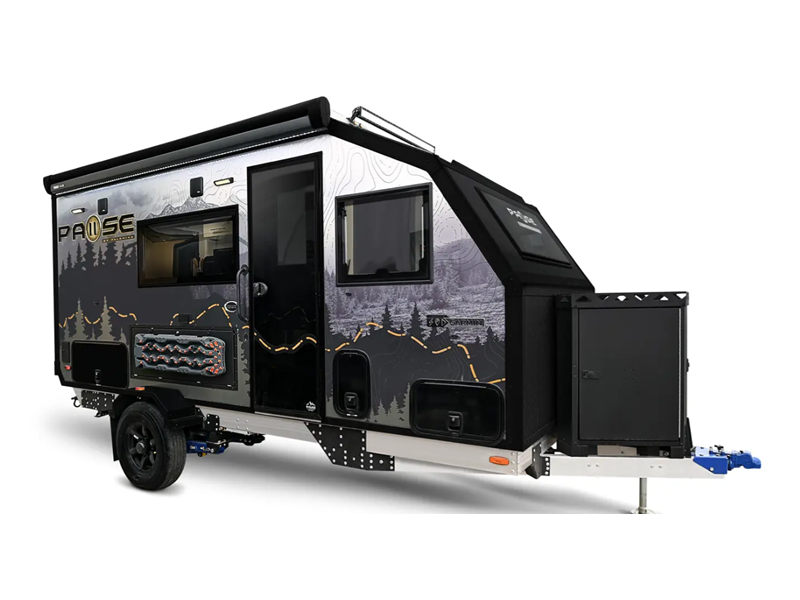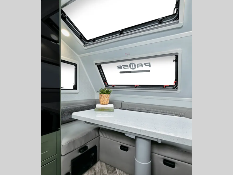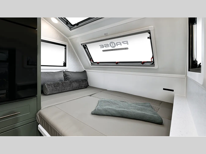 Built on a Huck-Rivet aluminum frame with Transcore composite walls, roof, and floor, there is no wood at all in the Pause. A full body wrap provides a unique look, while polyurea coated front wall and extrusions plus a puncture resistance underbelly provide protection. Inside you'll find aluminum cabinets and solid surface countertops, a Maxxair deluxe fan, and bath skylight for convenience and comfort.