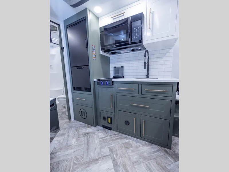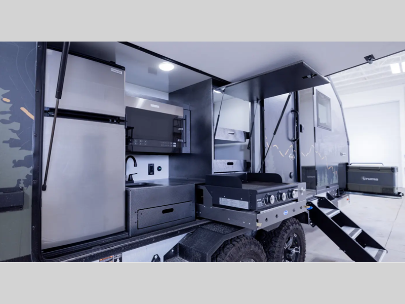 - Extended Slide Outside Kitchen w/12 Volt Truma Cooler, Grill/Griddle Combo, Collapsible Sink, Pull-Out Prep Table, and Outdoor Pantry (20.3 & 21.4 only)