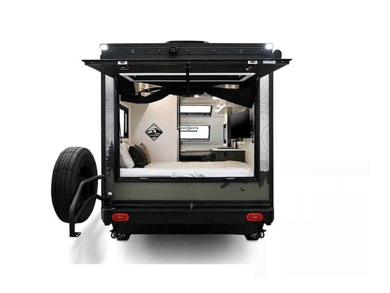 Built on a huck bolted aluminum frame with Transcore composite walls, roof, and floor, there is no wood at all in the Pause. A full body wrap provides a unique look, while polyurea coated front wall and extrusions plus a puncture proof underbelly provide protection. Inside you'll find aluminum cabinets and solid surface countertops, a 60" x 80" foldable queen bed, and an oversize lavatory for convenience and comfort.